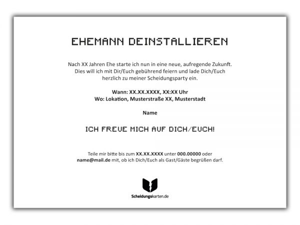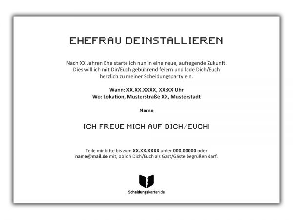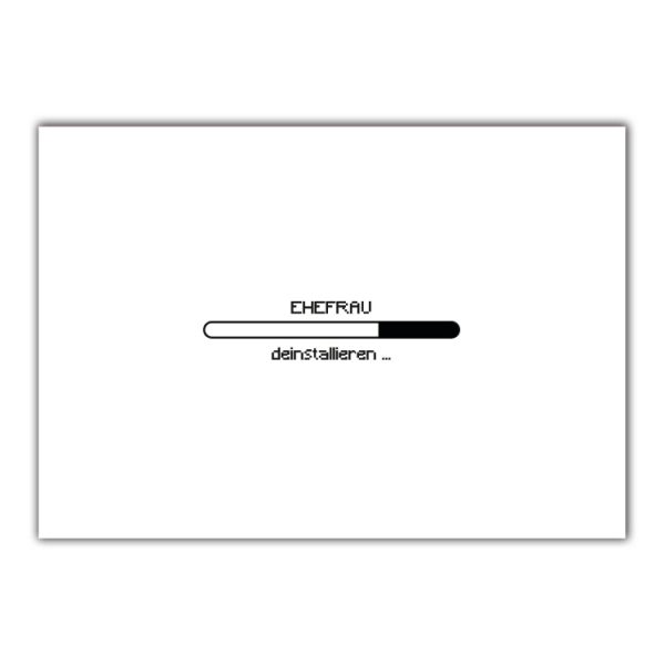 Unsere Deinstallieren Karten gibt es in den Formaten Din-A6 in Ex-Frau und Ex-Mann Version auf unserem berühmten 250 Gramm Scheidungskarton.