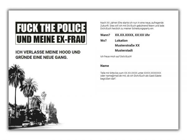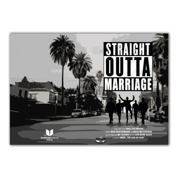 Unsere „Straight Outta Marriage“ Klappkarte gibt es in den Format Din-A5 auf unserem berühmten 250 Gramm Scheidungskarton.