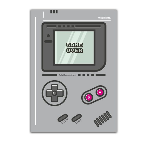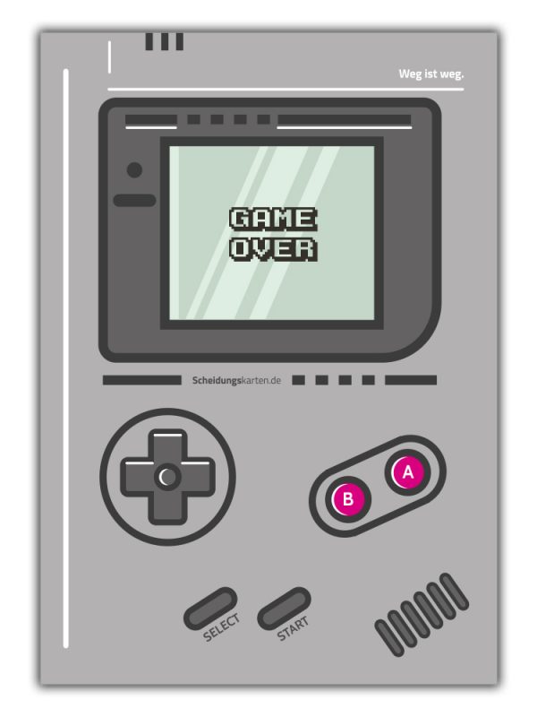 Unsere Gameboy Karte gibt es in den Format Din-A6 auf unserem berühmten 250 Gramm Scheidungskarton.