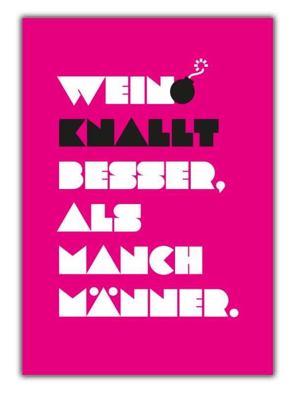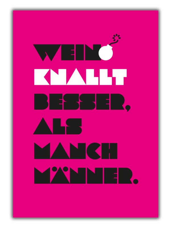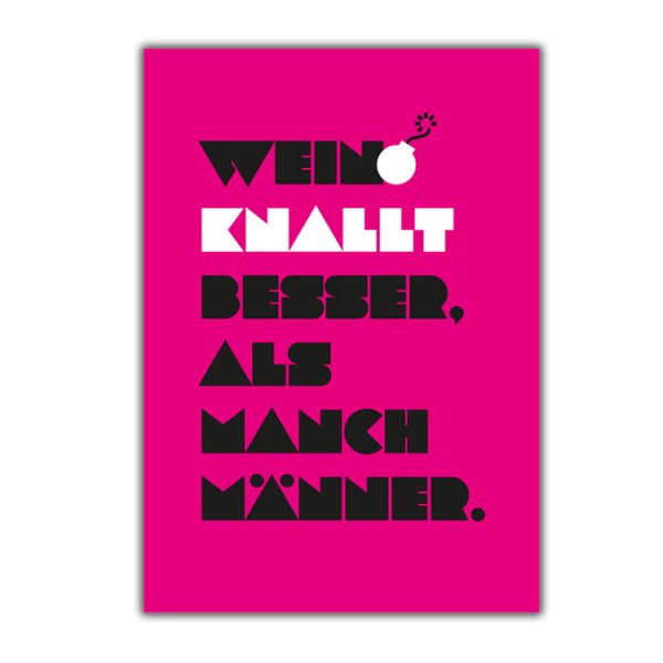 Unsere“Wein knallt besser, als manche Männer“ Karte gibt es in den Format Din A6 auf unserem berühmten 340 Gramm Scheidungskarton in 2 verschiedenen Versionen.